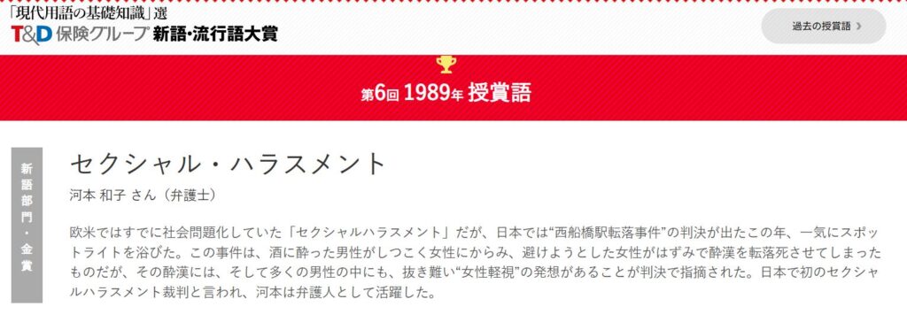 因みに「セクシャルハラスメント」は、1989年の新語・流行語大賞 / 新語部門・金賞を受賞しています。